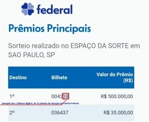 Exemplo dos 2 últimos digitos, do 1º prêmio da extração da Loteria Federal.